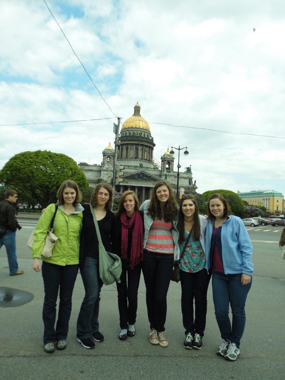 Once arriving by train, we walked to our hotel; Oktobersky, and got ready to begin our city tour of St. Petersburg.  We were introduced to our St. Petersburg tour guide, Svetlana (who knows Sergai), and were off to the bus for our tour.  We were briefly delayed because of bus problems, but our handy bus driver, Constantine, took out his tools and soon the new Mercedes bus was traveling the streets of the amazing city! Traveling through the streets of St. Petersburg left us in awe of all its beauty.  St. Petersburg is known as the Venice of the North, and we can all attest to this comment.  The city is completely different from Moscow, and the fast hustle isn’t as prominent as it was in Moscow.